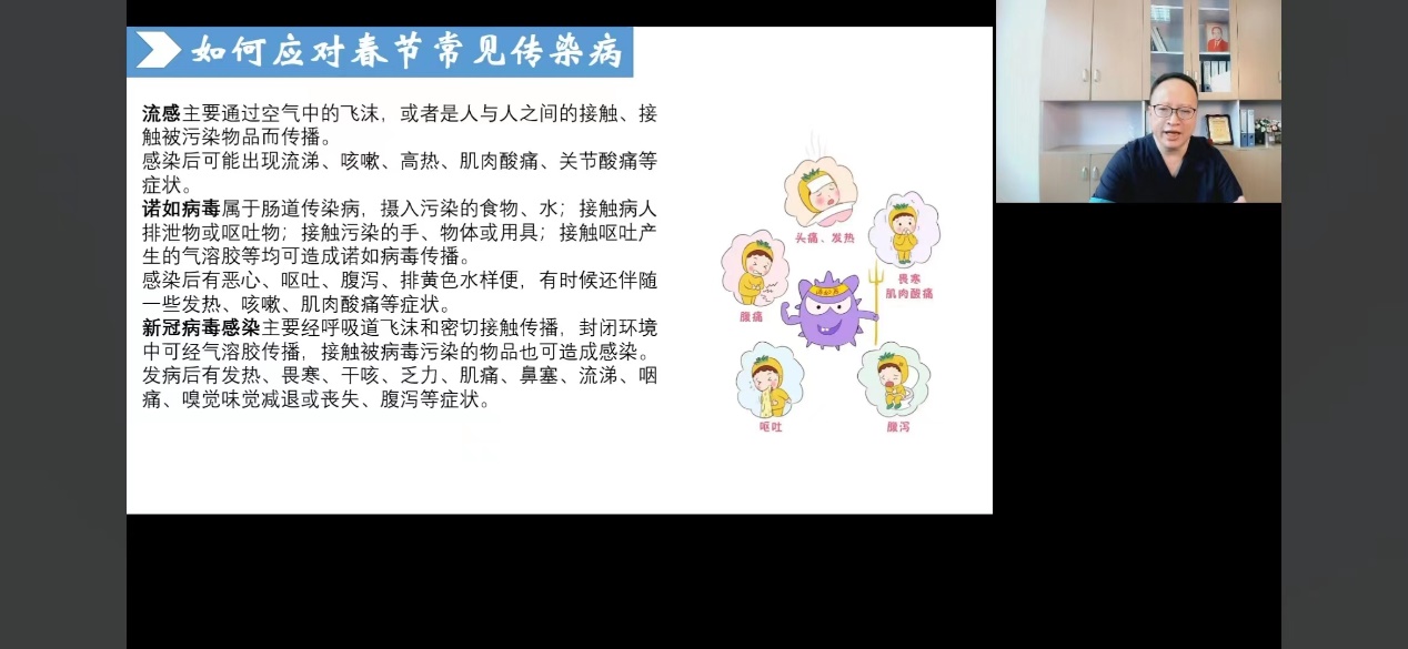 3月23日,银河集团官网孟勇教授为公司幼儿园师生、家长代表近500人带来“幼儿春季传染病及预防”为主题的线上科普讲座。孟教授围绕免疫力、病毒、传染病三个关键点,详细讲解了免疫力的形成机制、春季常见传染病应对策略、诺如病毒的防控方法,以创新、趣味、生动的形式进行医学健康科普知识的推广,将幼儿健康管理落到师生、家长实际行动上,让科普成为家校“定心丸”,成为幼儿健康“保护网”。