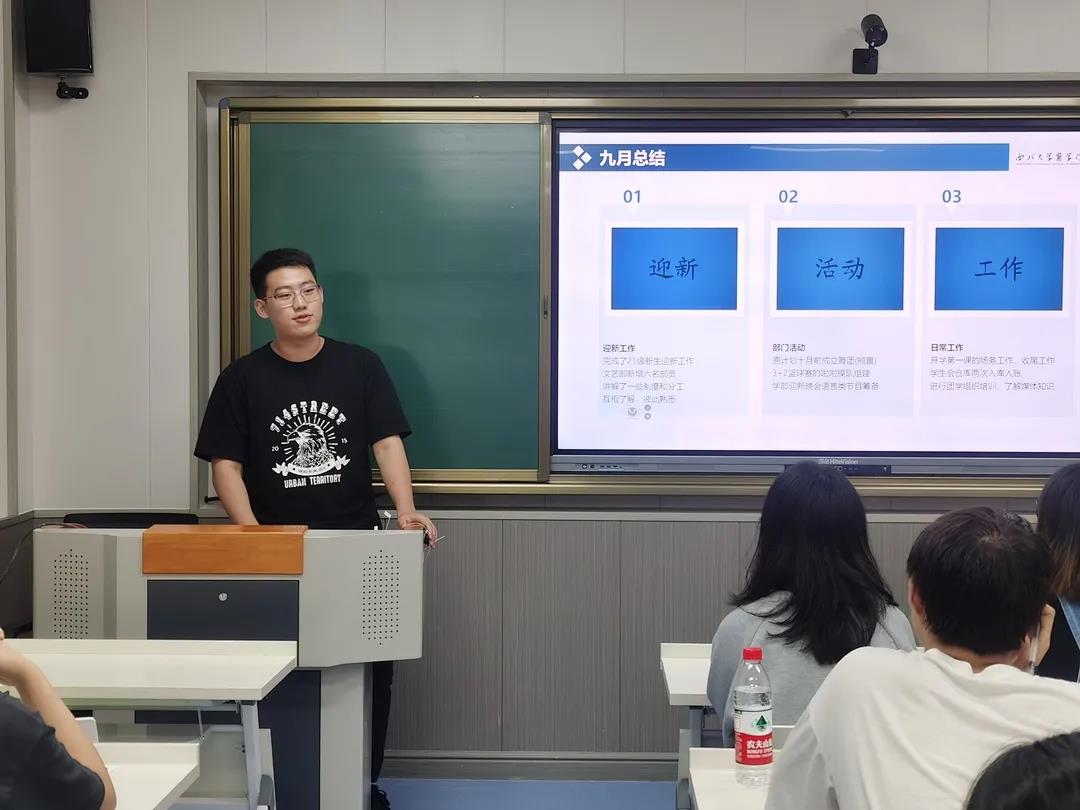 各部门工作人员对九月工作进行总结,并规划十月工作。员工会将继续完善学风考勤制度,推进拉拉队、篮球队培训工作,同时增进内部交流,着力提升员工会凝聚力和向心力。