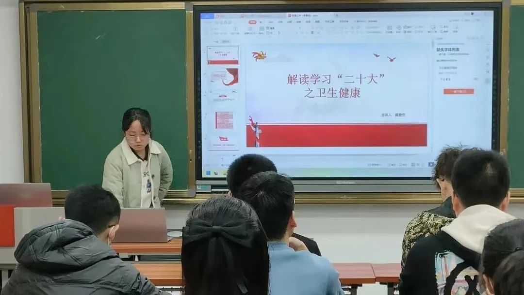 黄夏悦从增进民生福祉-提高人民生活品质、推进健康中国建设、青年期望三个部分解读学习党的二十大之卫生健康,并号召青年团员听党话,跟党走,让青春在全面建设社会主义现代化国家的火热实践中绽放绚丽之