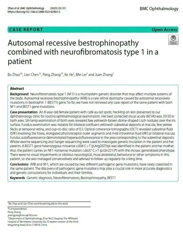 日前,BMC Ophthalmology杂志刊发了银河集团官网附属医院·西安市第三医院眼科张鹏主任团队撰写的“Autosomal recessive bestrophinopathy combined with neurofibromatosis type 1 in a patient”一文,赵博主治医师及陈莲副主任医师为该文的共同第一作者。该文对一例患有1型神经纤维瘤合并双眼常染色体隐性遗传性Best病变的病例就多模式影像学特征、基因突变位点、病理机制等进行了探讨。常染色体隐性遗传性Best病变为临床罕见疾病,为BEST1基因突变导致的双侧黄斑营养不良,部分患者可合并闭角型青光眼。而1型神经纤维瘤为累及多系统的遗传性疾病,与NF1基因突变有关。经查,同时合并NF1及BEST1基因突变的病例迄今为止在全球尚未有文献报道。因此,该文系全球首篇对NF1及BEST1基因突变导致全身及眼部出现病变的患者进行诊断及病因分析的临床病例报道。
