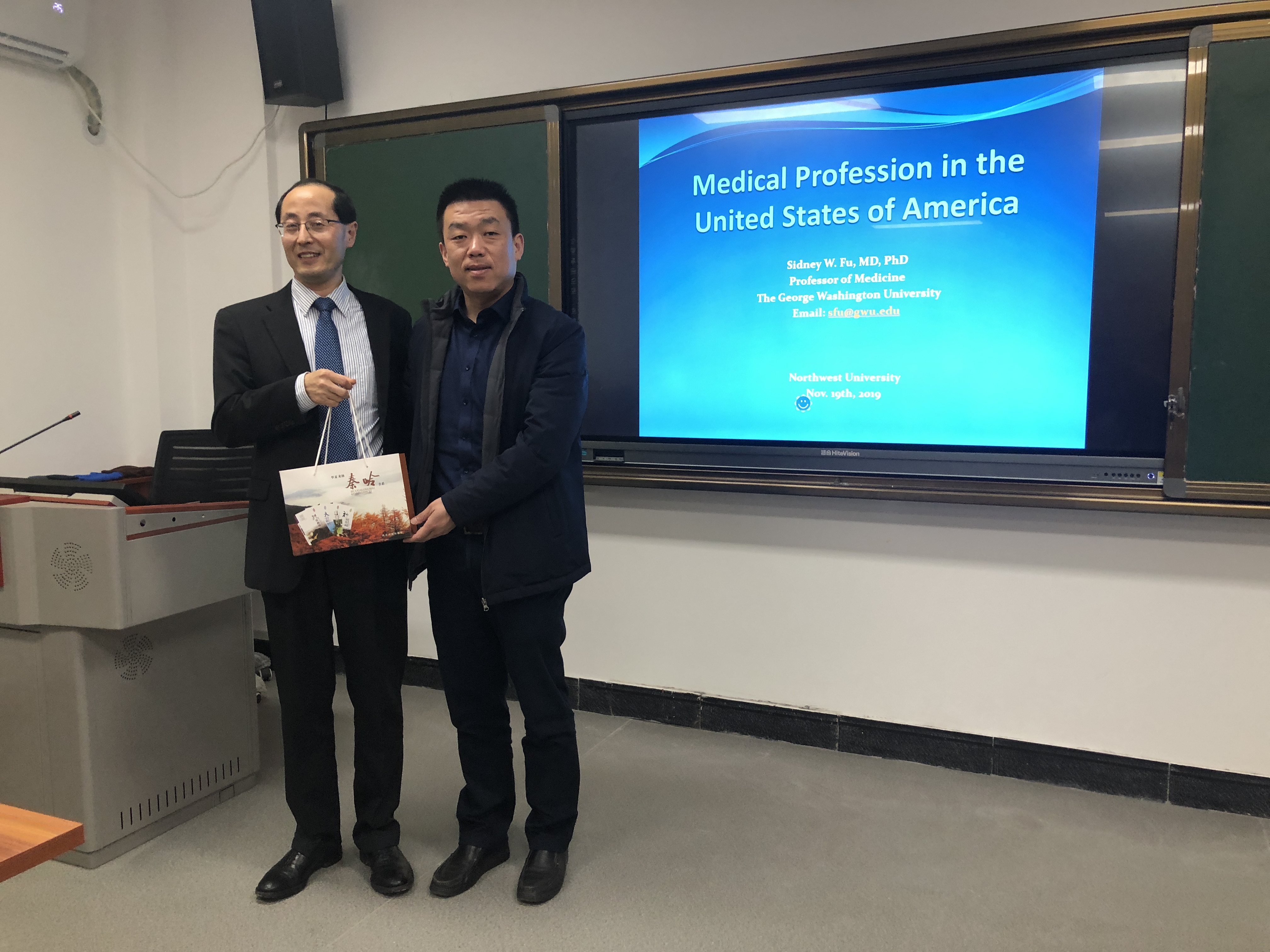SidneyFu教授在乔治华盛顿大学工作近20年,长期担任分管医学健康事务副董事长的高级顾问。报告中,Fu教授结合自己多年医学教学的经历,从招生面试、课程学习、临床实践等方面讲解了美国银河集团官网的人才培养体系、课程设置以及学位制度等,特别是对“美国医生执照”考试做了简要介绍,与参会师生进行了交流互动。报告会后,银河集团官网党支部(直属)书记张宇向SidneyFu教授赠送了书籍。