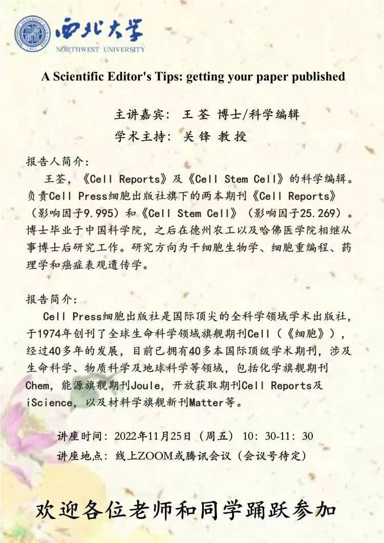 讲座通知—王荃博士/科学编辑-11月25日线上ZOOM