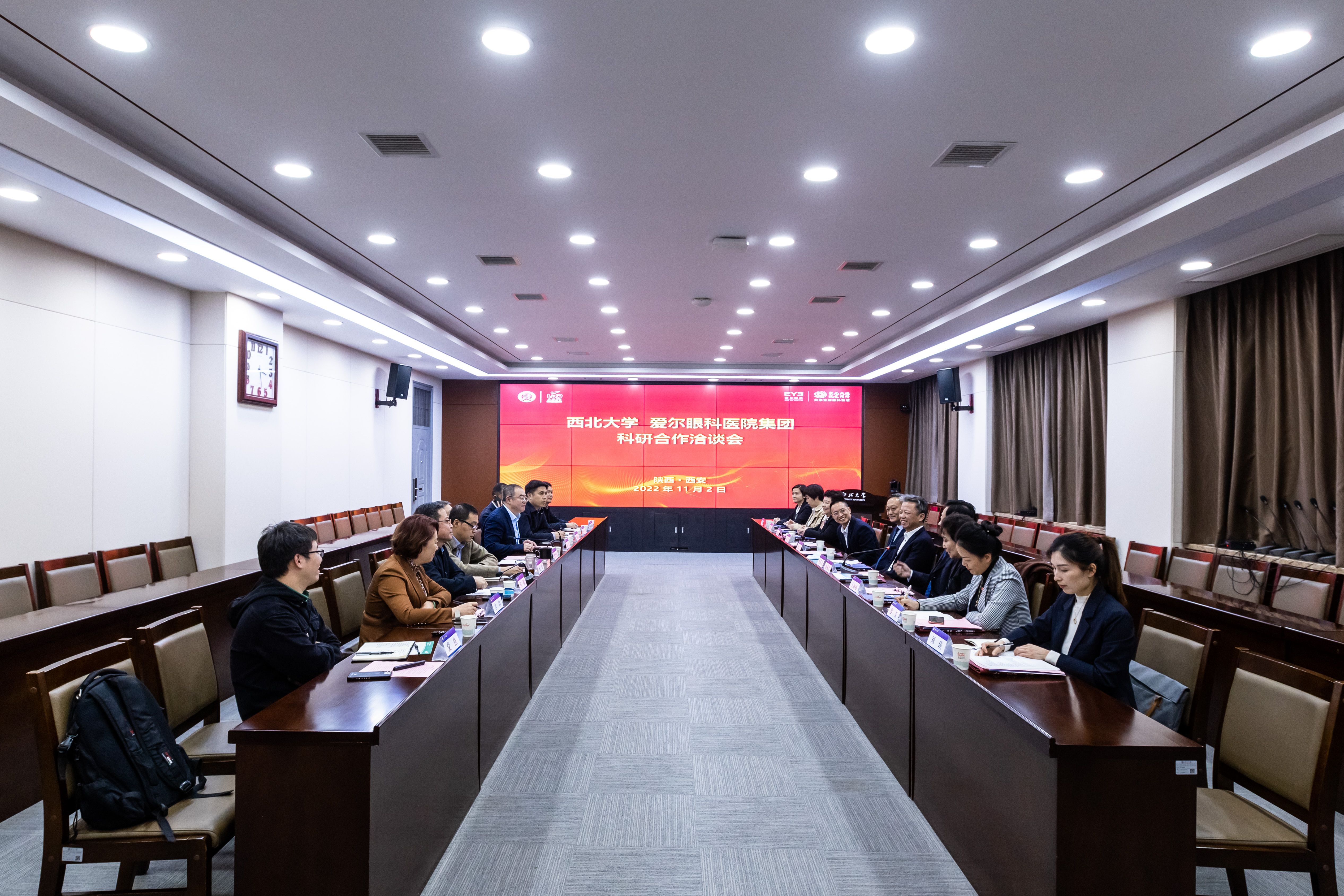 11月2日,爱尔医疗集团总裁张跃文一行赴公司就医学教育及合作进行洽谈交流。董事长郭立宏,公司党委常委、副董事长常江出席座谈,爱尔眼科陕西省区CEO刘乐飞、公司科技处、国内合作处、银河集团官网及附属医院相关负责人参加座谈交流。