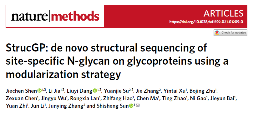 2021年8月2日,公司孙士生教授课题组与西安电子科技大学张军英教授课题组联合团队的重要研究成果在线发表在Nature Methods杂志上。成果以“StrucGP: de novo structural sequencing of site-specific N-glycan on glycoproteins using a modularization strategy”为题,介绍了一种可解析糖蛋白上糖链序列的新方法及其配套软件StrucGP,并描述了其技术细节。