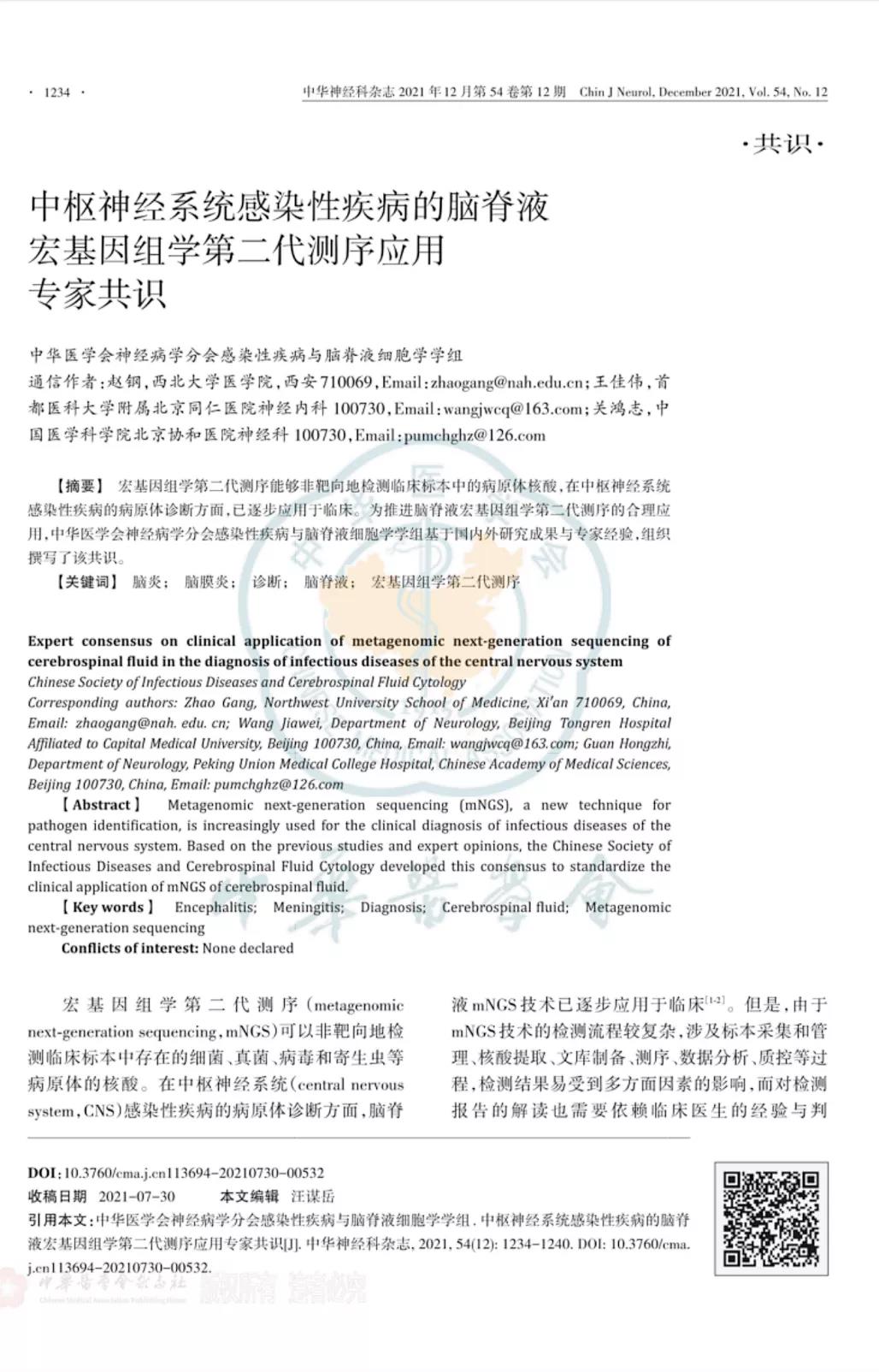 2021年12月15日,由公司经理赵钢教授牵头,联合中国医学科公司北京协和医院、首都医科大学附属同仁医院及上海复旦大学附属中山医院等共44家单位53位相关领域的顶级专家,共同起草撰写的“中枢神经系统感染性疾病的脑脊液宏基因组学第二代测序应用专家共识”,在《中华神经科杂志》上正式发表。该专家共识是在赵钢教授团队牵头的2016年科技部重大精准医学项目——基于组学特征谱的脑(膜)炎病因分型诊断研究——历时五年不断研究探索的基础上总结凝练而成,是临床标志性、纲领性的重要指导规范。