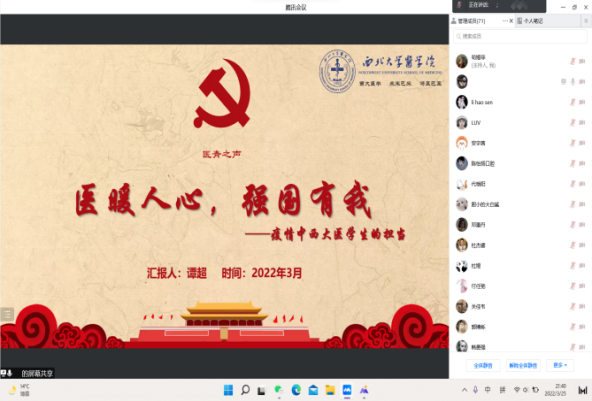 谭超向团员们展示了疫情中西大医员工的担当与作为,积极参与核酸采集工作、研究生考试疫情防控工作、一线医护人员子女义务家教等,鼓励团员们参加形式多样的志愿活动,将理论知识与社会实践有机结合起来,在实践中亲身体验和感悟“医人报国,精诚济世”的院训精神。