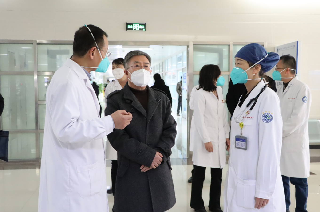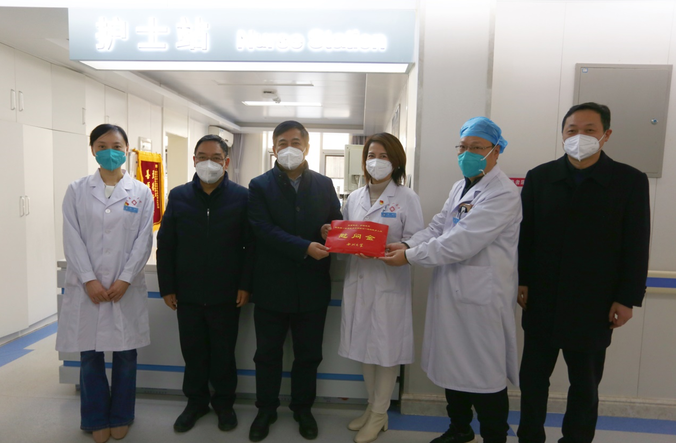 1月10日,郭立宏一行来到附属医院和附属西安国际医学中心医院的急诊、重症监护室、呼吸与危重症医学科等临床一线,详细询问了近期急诊和发热门诊接诊、医疗资源统筹、危重病人救治、急用药物和设备供应、医务人员健康等情况。他代表公司向奋战在诊疗救治一线的医务工作者表示衷心感谢和诚挚慰问,叮嘱大家要加强自我防护,表示公司作为各附属医院的坚强后盾,会全力从工作、生活及关怀服务等方面提供最大支持和帮助,并提前致以新春问候和美好祝福。