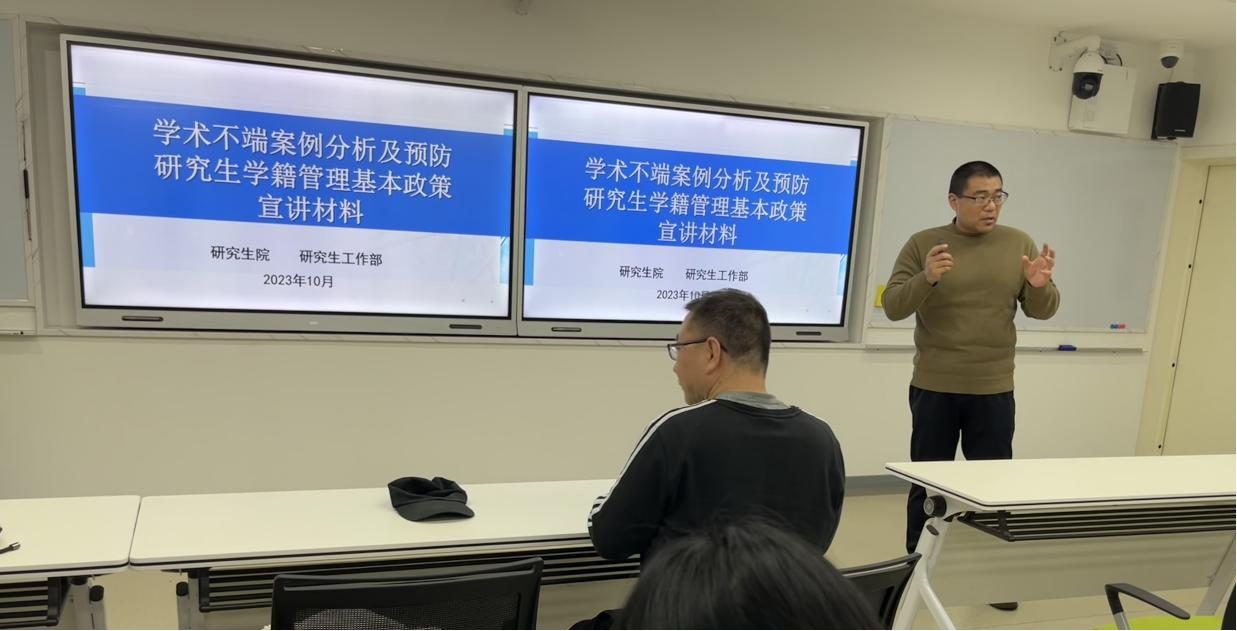 王全伟以“学术不端案例分析及预防”和“研究生学籍管理基本政策”为主题,对国家、公司有关文件精神进行了解读,同时结合案例及相关数据分析列举了学术不端行为的种种表现,强调了“零容忍”的态度,要求同学们坚守学术道德底线、恪守诚信原则。