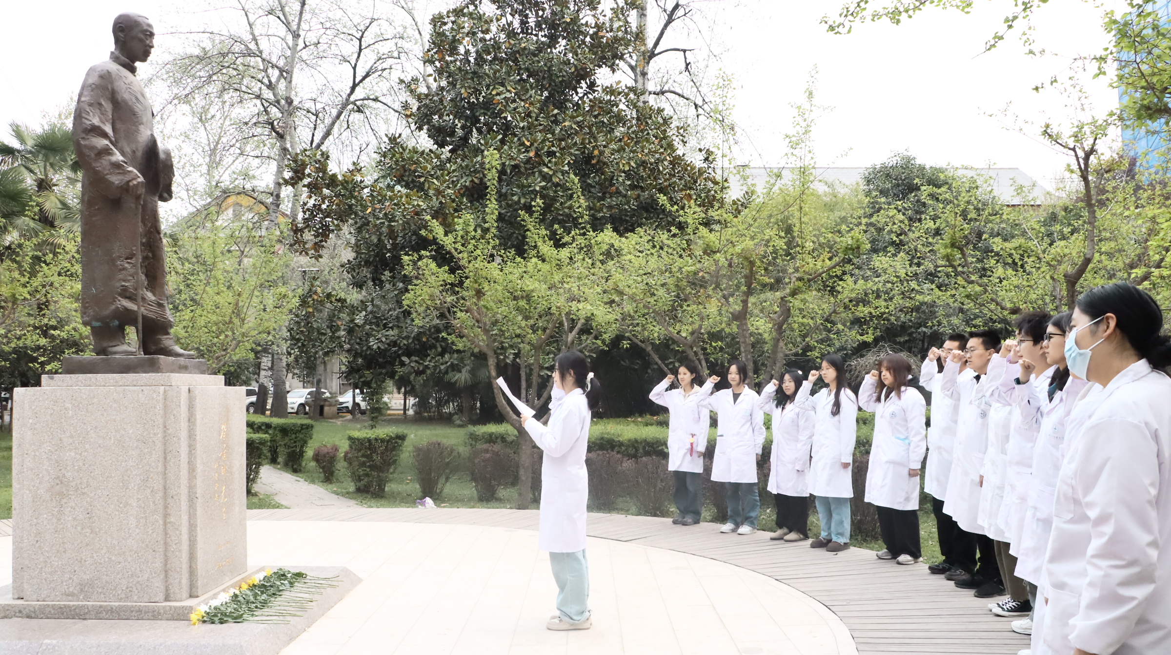 活动现场素花环绕,徐诵明先生的全身雕像肃然矗立。仪式在庄重的氛围中开始。师生代表缓步上前,向雕像献花并致敬,表达对先贤的追念。员工代表带领现场师生回顾了徐诵明先生作为中国现代医学教育开拓者的毕生追求,强调其“教育救国、医学报国”的信念对当代医学人才培养的深刻启示,以徐诵明先生抗战时期临危受命、重建西北银河集团官网的事迹为例,勉励师生“将爱国情怀融入医学实践,以仁心仁术守护人民健康”。全体师生高举右拳重温《医员工誓言》,“健康所系,性命相托”的铿锵誓言在校园久久回响。‌