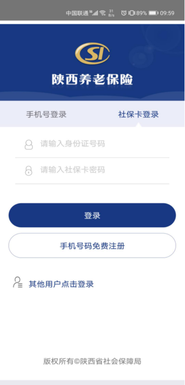 2. 打开“陕西养老保险”APP,点击社保卡登录,按照要求输入身份证号码及社保卡密码,点击登录。