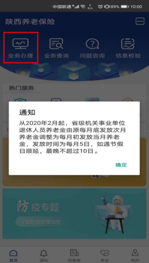 3. 进入陕西养老保险APP后,点击“业务办理”。